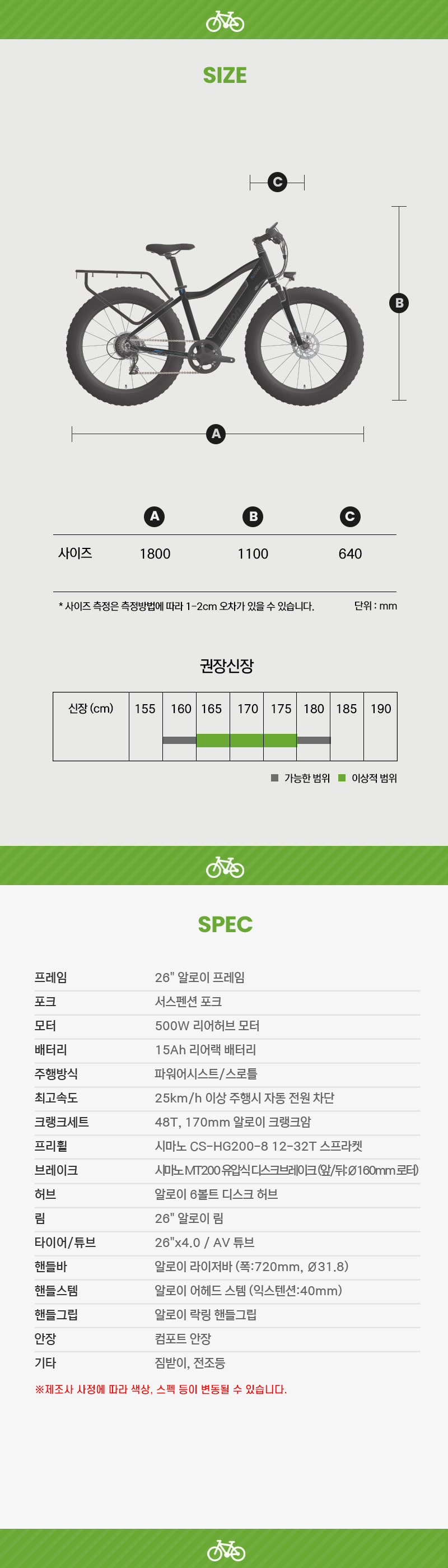 - 제품 보증기간은 구매일로부터 프레임은 1년, 부품(모터, 전기자전거 배터리 포함, 기타부품류)은 6개월입니다. 무상A/S기간내 발생한 부품 불량은 해당 품목만 재발송됩니다.