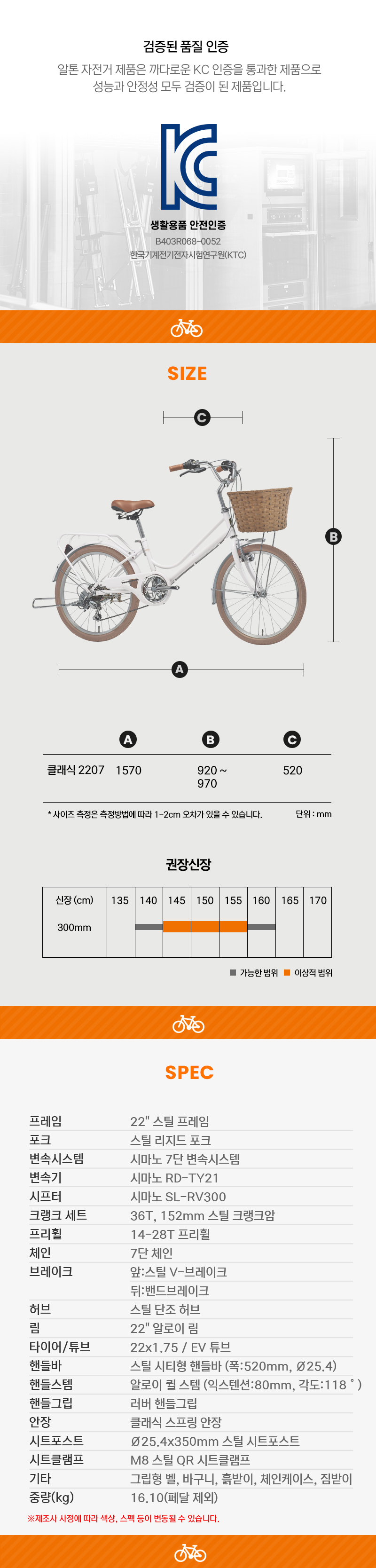 | 크기, 중량 | 22인치 프레임, 16.10kg(페달 제외) | ||
