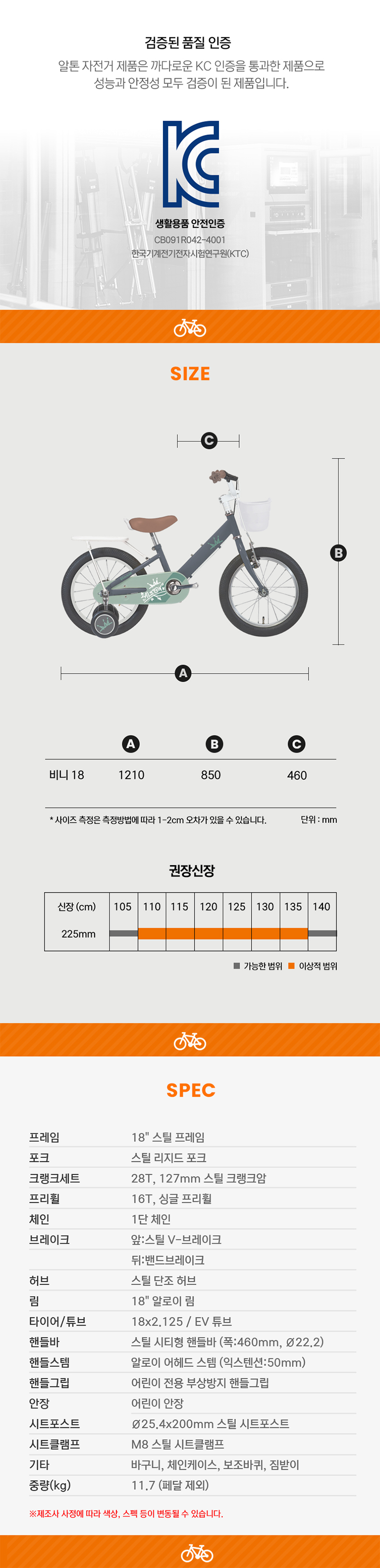 | 크기, 중량 | 18인치 프레임, 10.7Kg (페달 제외,18인치 기준) | ||