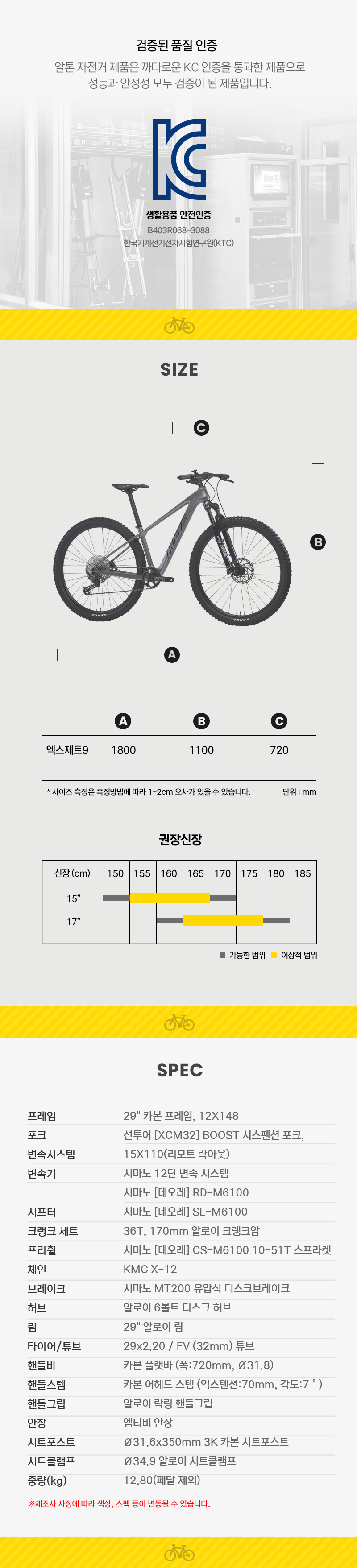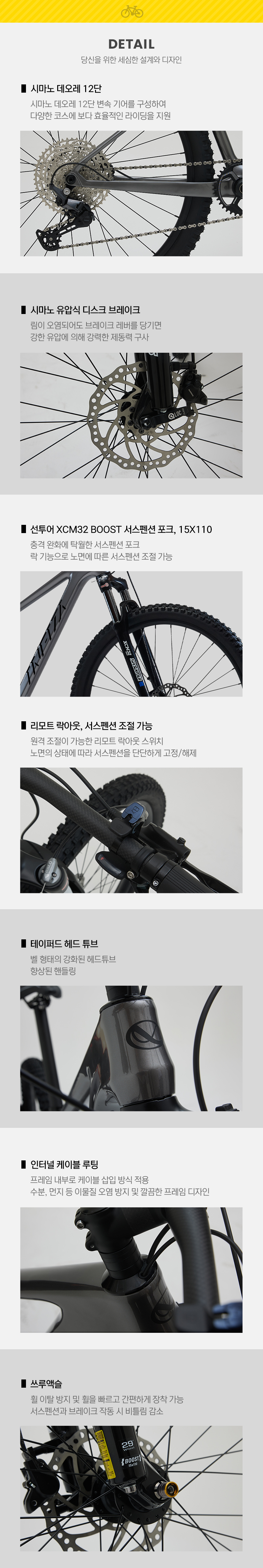 | 상품별 세부 사양 | 시마노 데오레 12단,카본 프레임,카본 핸들바, 스템, 시트포스트,선투어 [XCM32] BOOST 서스펜션 포크(리모트 락아웃),쓰루액슬,시마노 유압식 디스크브레이크,인터널 케이블 루팅,테이퍼드 헤드튜브 | ||